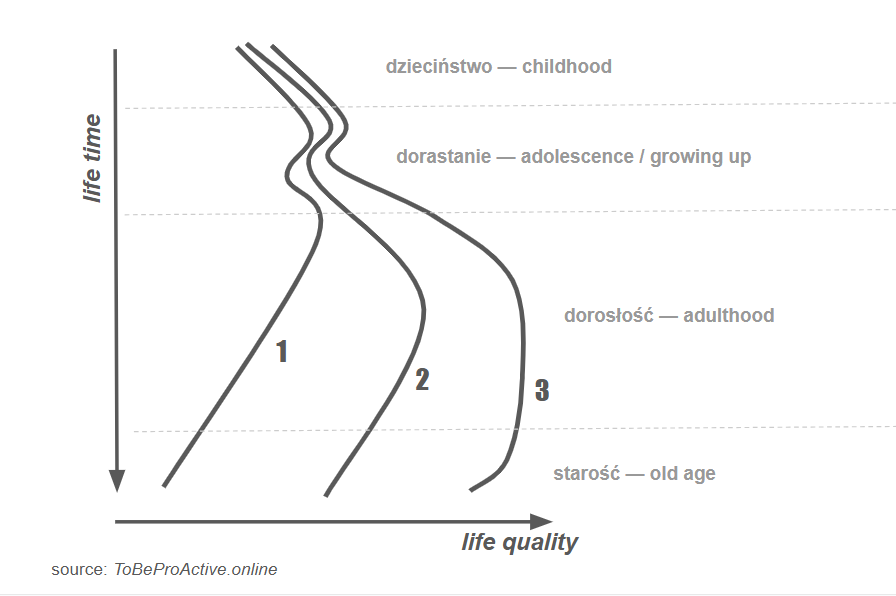 Krzywa 1: pokazuje dynamikę rozwoju jakości życia wzrastającej tylko w okresie dzieciństwa i dorosłości kiedy otrzymujemy obowiazkowy poziom edukacji. Po tym okrese przy braku rozwoju i dbania o opisywane 9 elementów w poprzednich wpisach może nastapić systematycznie jej pogarszanie.